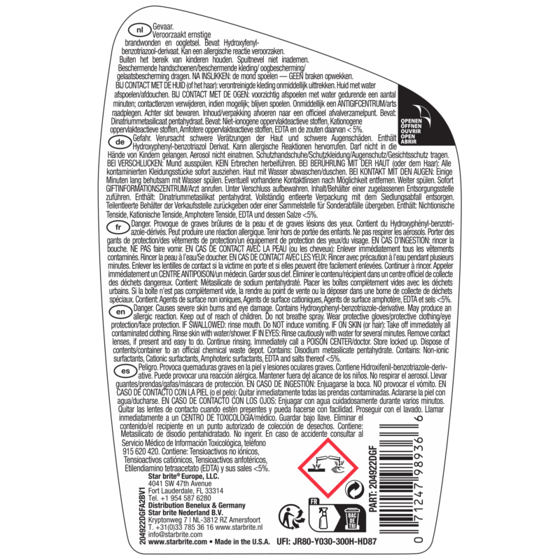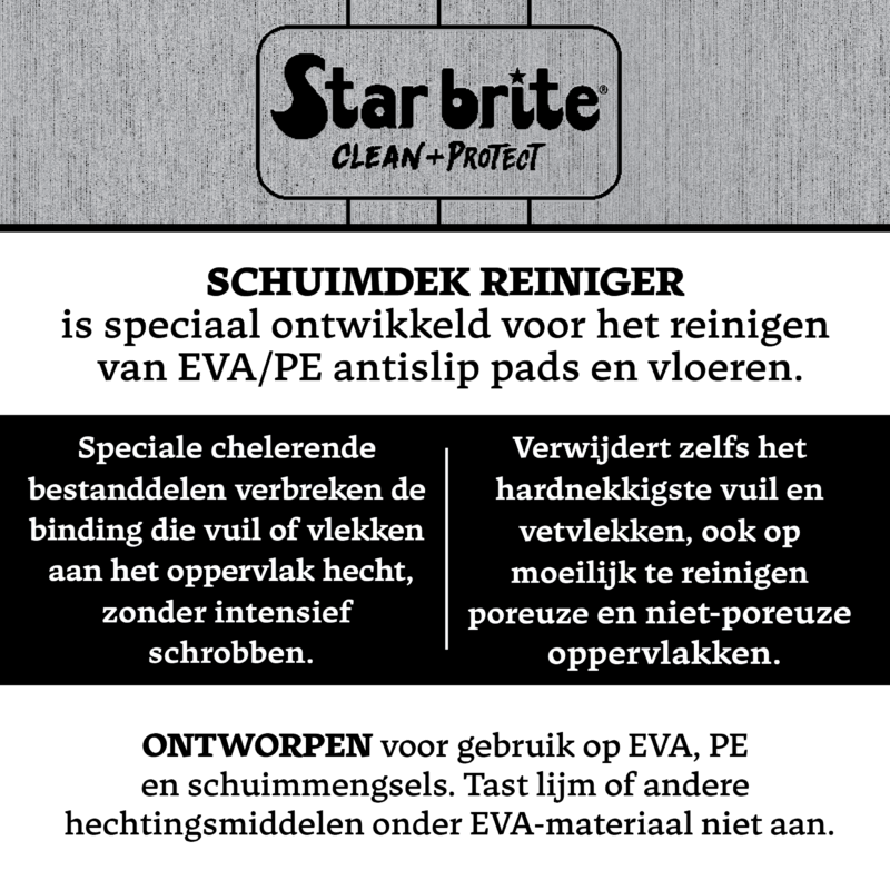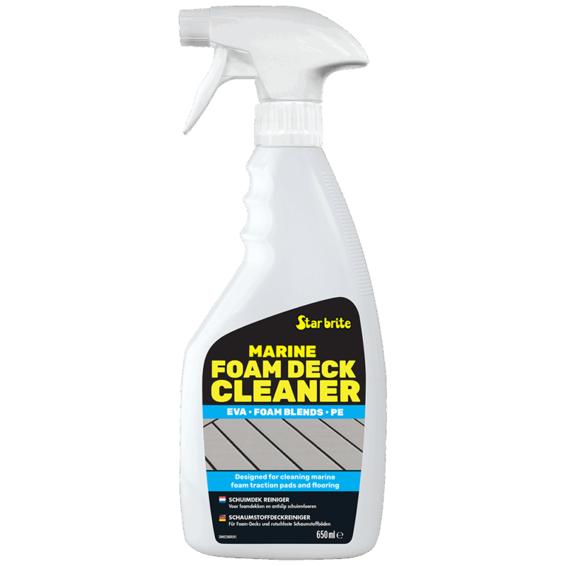 Star brite Schuimdek Reiniger is speciaal ontwikkeld voor EVA-, PE- en gemengde maritieme schuimdekvloeren. De krachtige, diep-reinigende formule verwijdert hardnekkige vlekken, vuil, visbloed, zonnebrandcrème en zoutafzettingen zonder het oppervlak te beschadigen. Veilig te gebruiken op alle bekende merken schuimdek zoals SeaDek®, DEKit®, MarineMat® en vergelijkbare materialen. De formule tast het schuim of omliggende oppervlakken niet aan en helpt de oorspronkelijke uitstraling en grip van schuimpads te herstellen. De antislipwerking wordt verbeterd, waardoor het dek er weer als nieuw uitziet. Dankzij de gebruiksklare spray is mengen niet nodig – eenvoudig opspuiten, licht schrobben en afspoelen. De snelwerkende reiniger dringt diep door en verwijdert vuil zonder zwaar te hoeven schrobben. Ideaal voor boten en waterscooters – perfect voor het reinigen van dekpads, zwemplatforms en treden. De maritieme formule is veilig voor gebruik in alle wateromgevingen en geschikt voor alle soorten vaartuigen.